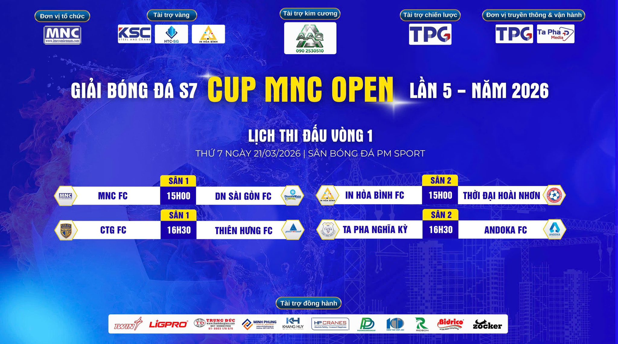 Giải bóng đá S7 Cup MNC Open lần 5 – năm 2026 sẽ chính thức khởi tranh và diễn ra với lịch trình cụ thể như sau: