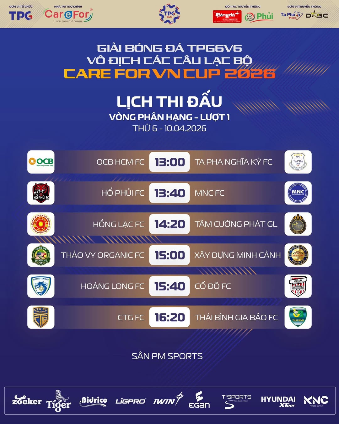 Sau bao ngày chờ đợi, giải bóng đá vô địch các Câu lạc bộ TPG6v6 – Care For Việt Nam Cup 2026 sẽ chính thức khai diễn vào chiều nay. Toàn bộ các trận đấu trong khuôn khổ vòng phân hạng lượt 1 sẽ được tổ chức tại địa điểm quen thuộc của giới phủi miền Nam.