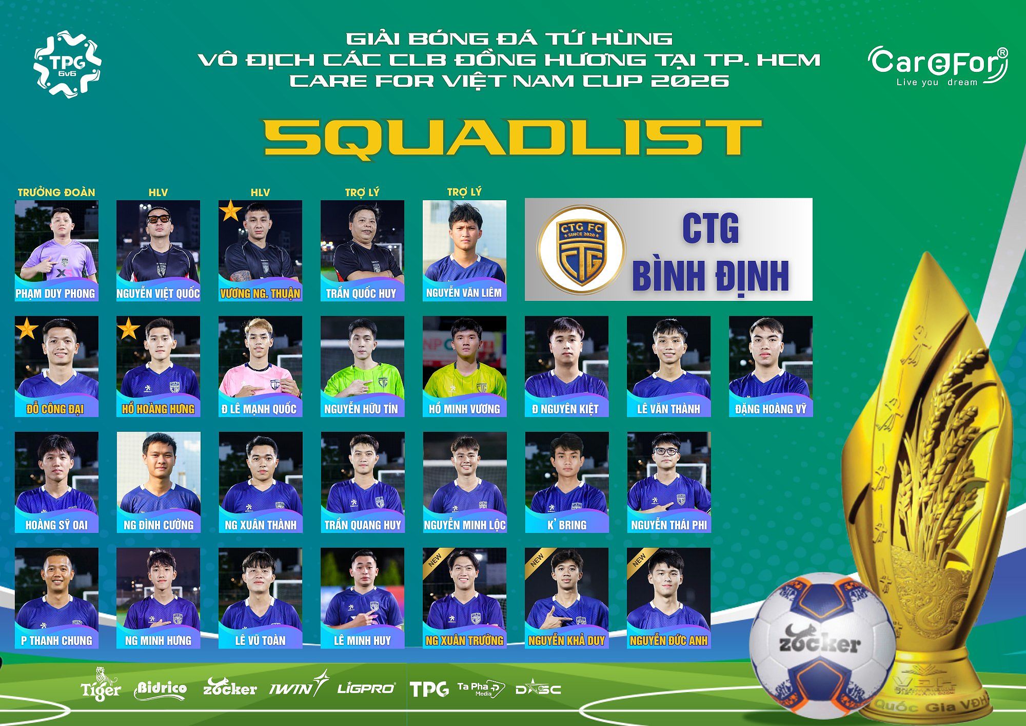 Với tư cách là Đương kim vô địch của Care For Việt Nam Cup 2025, CLB CTG Bình Định đã chính thức lộ diện và công bố danh sách đăng ký thi đấu, sẵn sàng cho hành trình bảo vệ ngôi vương tại Giải Tứ Hùng năm nay.